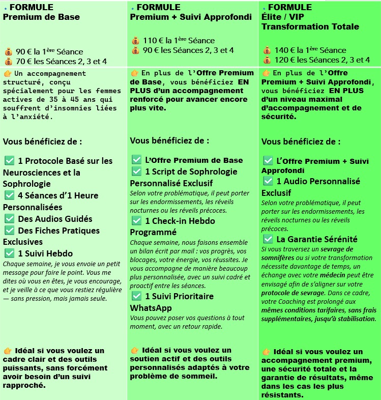 Ce Coaching ne traite pas les insomnies chroniques idiopathiques (depuis l’enfance), secondaires (syndrome jambes sans repos, apnée du sommeil, SSPT), paradoxales (plainte d’un sommeil non réparateur malgré un sommeil réparateur), d’hygiène du sommeil, psychiatriques, médicales ou encore médicamenteuses (suite à prise ou arrêt d’un traitement).